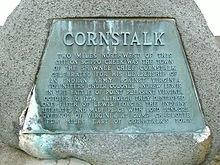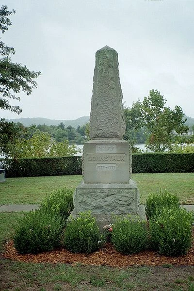 "The last page of a sad chapter of American history was written at this Ohio River community today [September 21st 1954]. Chief Cornstalk, the Shawnee Indian leader who was taken hostage and murdered by white men to whom he had come to talk peace, was given a final resting place in a small park near the field of his most famous battle. His oft-moved grave now lies beside those of Colonial soldiers killed in that struggle the battle of Pt. Pleasant, Oct. 10, 1774 and Frontier Heroine Ann Bailey. In a lengthy ceremony at noon today, Cornstalk's last remains, three teeth and 15 bone fragments, were sealed in an aluminum box in the center of a four-ton stone monument bearing the simple inscription: 'Cornstalk.'