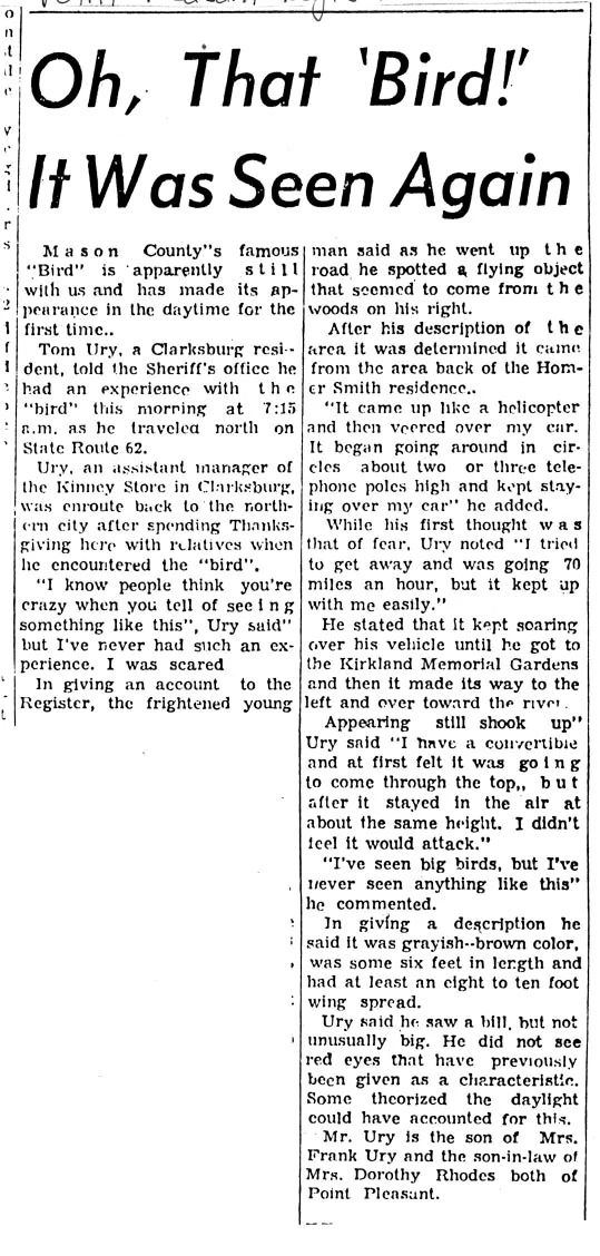 The following is an article from the Point Pleasant Register on November 25th 1966 titled 'Oh, That 'Bird!' It Was Seen Again '