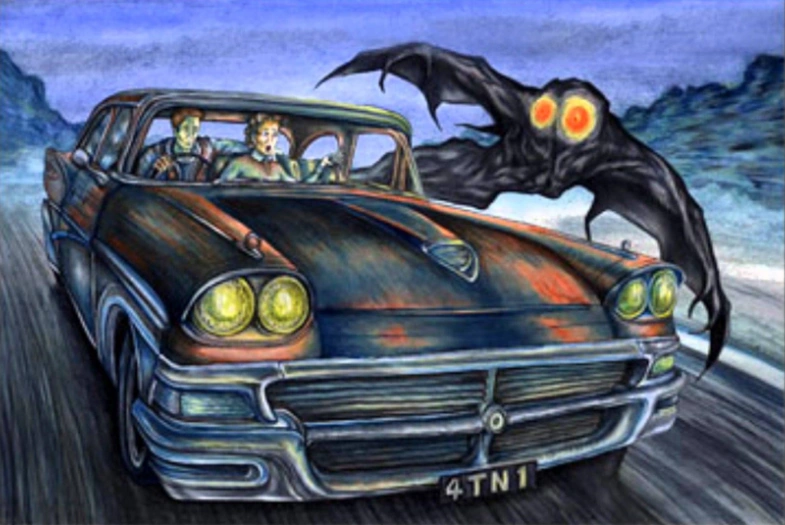 As they went along a straight stretch of road, they were going over 100 miles per hour but the creature was still able to follow them. They saw it in the back window and saw the shadow go across the car as it flew, they couldn't get away from it. They could also hear the wings hitting the top of the car as they drove. It's even said to have left scratch marks on Roger's '57 Chevy.