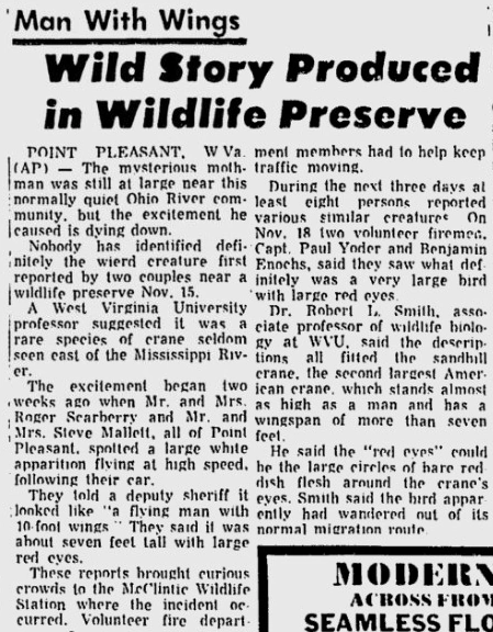 Dr. Robert L Smith, associate professor of wildlife biology at WVU said the descriptions all fitted the sandhill crane the second largest American crane which stands almost as high as a man and has a wingspan of more than seven feet.