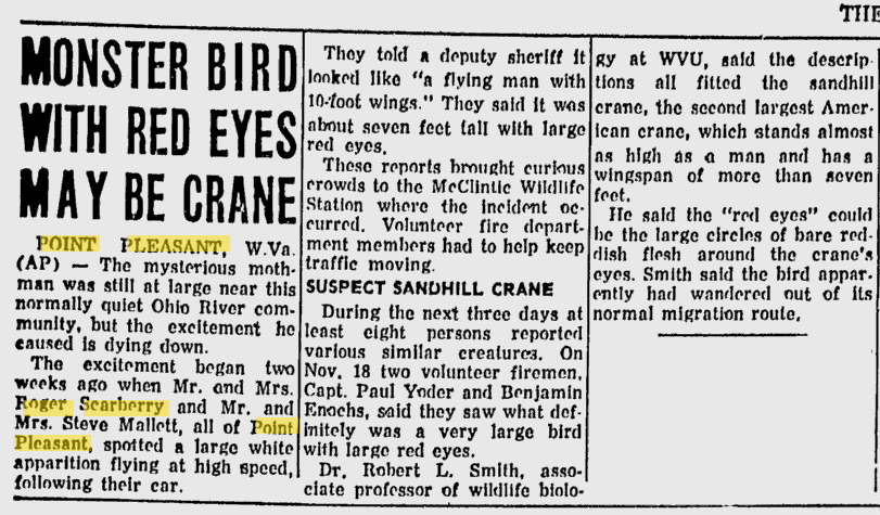 The same article was also printed under the title 'Monster Bird With Red Eyes May Be Crane'